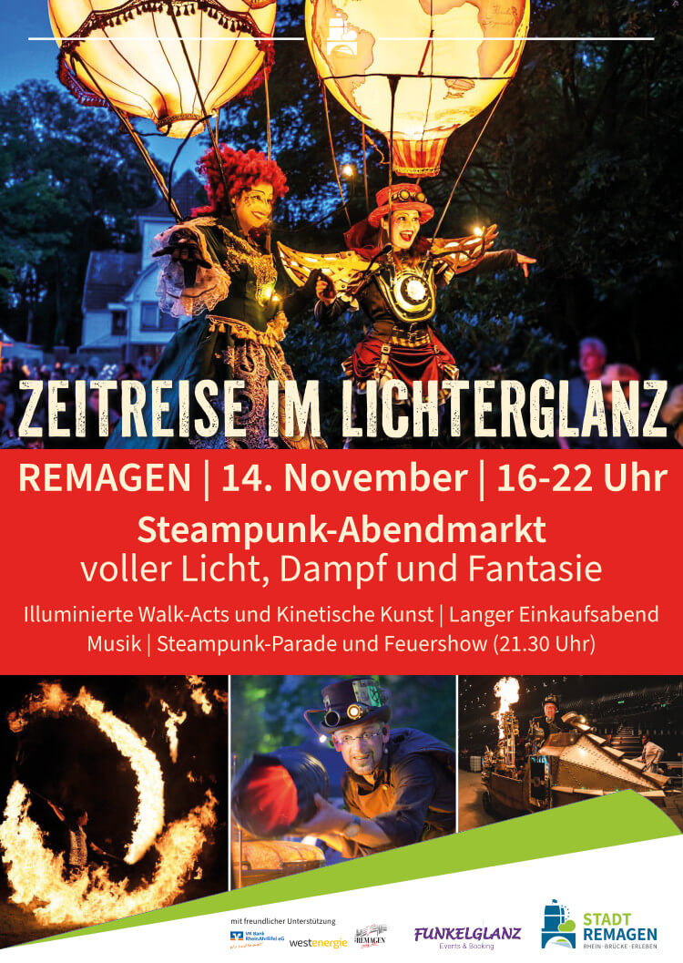 Am Freitag, den 14. November, verwandelt sich die Remagener Innenstadt in ein leuchtendes Szenario wie aus einem Jules-Verne-Roman. Unter dem Motto „Zeitreise im Lichterglanz – Steampunk-Abendmarkt voller Licht, Dampf und Fantasie“ lädt die Stadt Remagen gemeinsam mit Funkelglanz Events & Booking zu einem außergewöhnlichen Abend ein – mit Illuminationen, Marktständen, Walk-Acts, einem langen Einkaufsabend und einer Feuer-Show zum Abschluss.